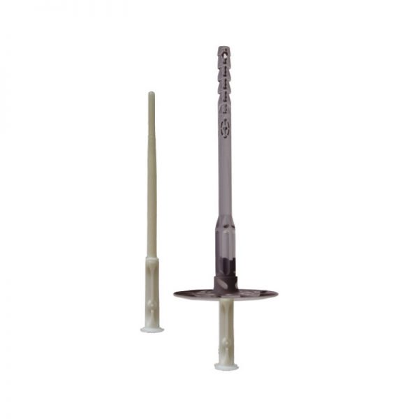 Tassello a percussione per fissaggio di pannelli a partire da 6 cm. Corpo in polipropilene e spina in PA (poliammide-nylon). Certificato per fissaggio su calcestruzzo-mattoni pieni-mattoni semipieni (forati verticalmente).